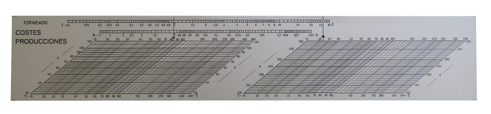 Del manual: Con el empleo de la Regla-Abaco de Torneado de CIFE, podemos determinar rápidamente los conceptos: - Velocidad de corte (v) - Revoluciones por minuto (n) - Tiempo máquina (To) - Esfuerzo tangencial de corte (Pz) - Potencia necesaria para el corte (N) - Coste de la unidad de volumen de viruta (Ic) - Producción de viruta por unidad de tiempo (Ip) Estos conceptos se obtienen respectivamente para las operaciones de cilindrado exterior o interior y refrentado. Para que la regla nos dé valores óptimos de condiciones de trabajo, el cálculo de los avances y las duraciones de herramientas que se quieren obtener han tenido que realizarse siguiendo los criterios que marcan las Normas Rusas, para la obtención del “Régimen Económico” o de “Máxima Producción”, respectivamente, según cual de ellos se quiera obtener. |