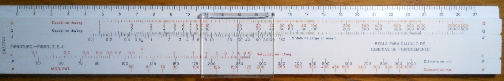 Escalas: | Cm / (Q caudal), (Q caudal) / (J pérdida de carga), (V velocidad), (Ø diámetro), (Ø diámetro) |