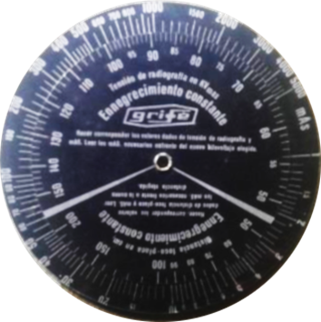 | Escalas: | Específicas para el cálculo de radiación recibida por un paciente a 1 m, en el anverso, y para la uniformidad de la grabación en la placa, en el reverso. |