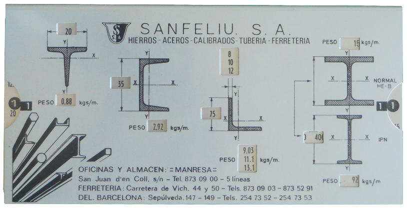 | Escalas: | Anverso: (ancho) / (longitud), (superficie) / (espesor) / (peso), (tabla selección peso varillas) reverso: (tabla de selección de pesos según perfiles) |