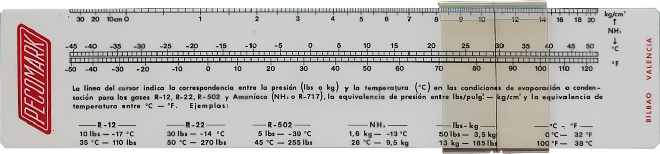 | Escalas: | Anverso: conversión entre temperatura agentes refrigerantes y presiones. Reverso: conversión entre ºC y ºF y presión agente refrigerante |