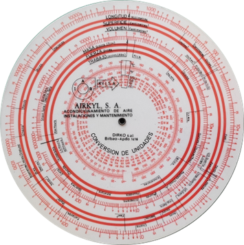 Escalas: | Anverso: (longitud), (superficie), (volumen); (masa), (fuerza), (trabajo); (ºC), (ºF); (SSU), (SR), (ºE), (cst) Reverso: (presión – potencia); (caudal); (densidad – par); (conductividad), (calor), (conductancia) |