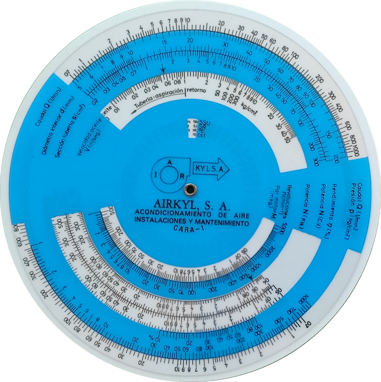 Escalas: | Anverso: (sección cable al aire), (en tubos), (amperios) // (voltios) /// (kW), (cv) /// (kW), (cv) Reverso: (amperios) // (voltios) /// (kW), (cv) // (cosφ) // (kWr) // (cosφ) |