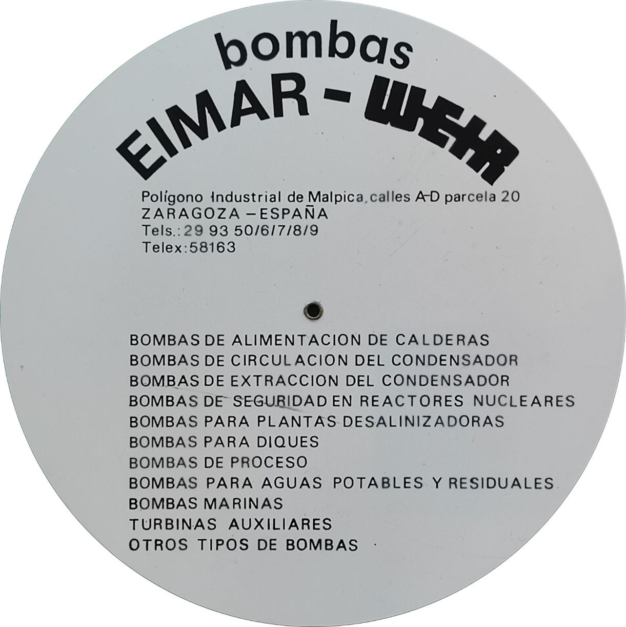 | Escalas: | Anverso: tabla selección: (elemento) // (diámetro) (long. equiv.) ||| (l/m), (m3/h) // (diámetro) // (pérdida de carga) ||| (caudal) // (velocidad) – (pres. dif) // (diámetro interior) – (potencia) // (↑) – (rendimiento) Reverso: propaganda Eimar - Weir |