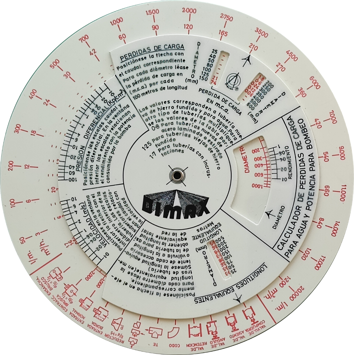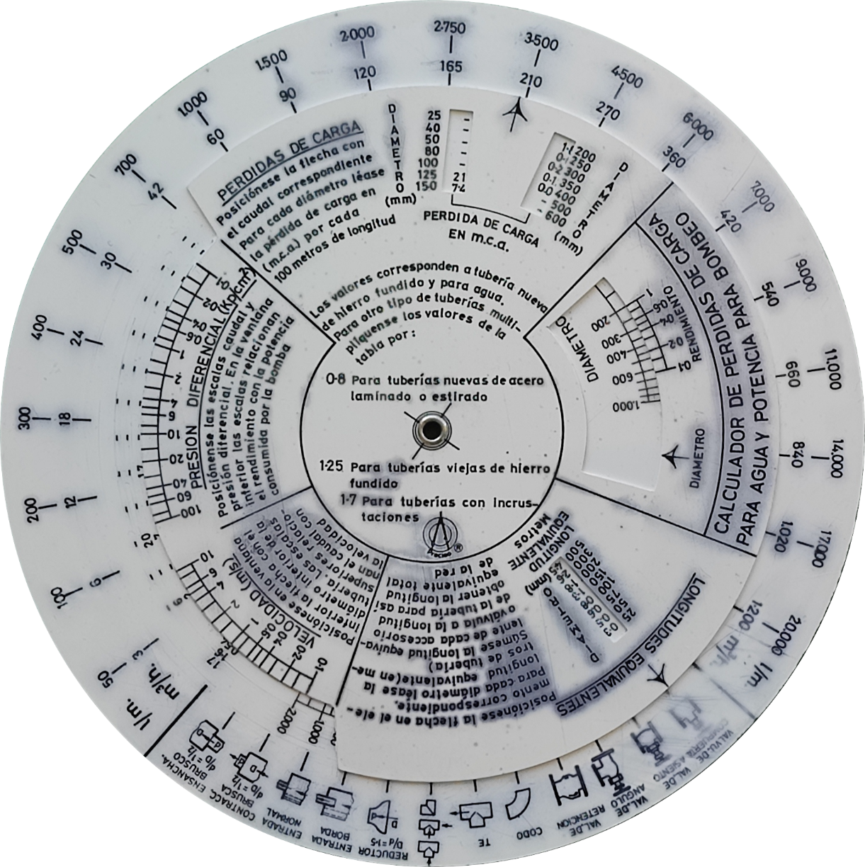 Escalas: | Anverso: tabla selección: (elemento) // (diámetro) (long. equiv.) ||| (l/m), (m3/h) // (diámetro) // (pérdida de carga) ||| (caudal) // (velocidad) – (pres. dif) // (diámetro interior) – (potencia) // (↑) – (rendimiento) Reverso: en blanco |