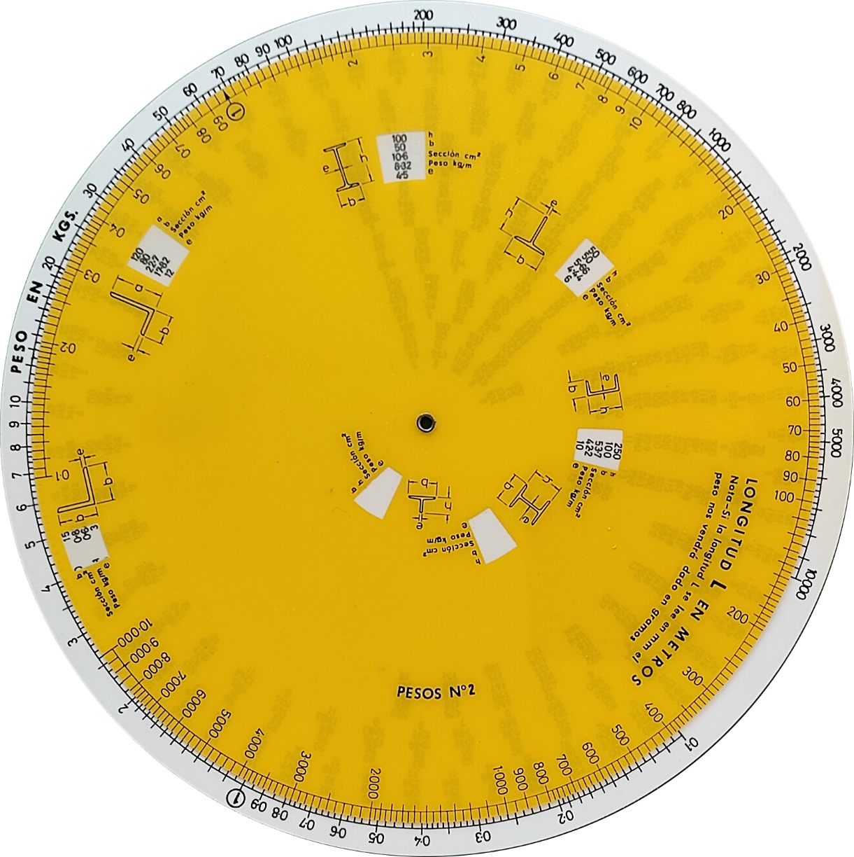 Escalas: | Anverso: (peso) // (longitud) // (diámetro) // (espesor) // (Diámetro), (Área) // (espesor) Reverso: (peso) // (longitud) // (tabla selección parámetros vigas). |