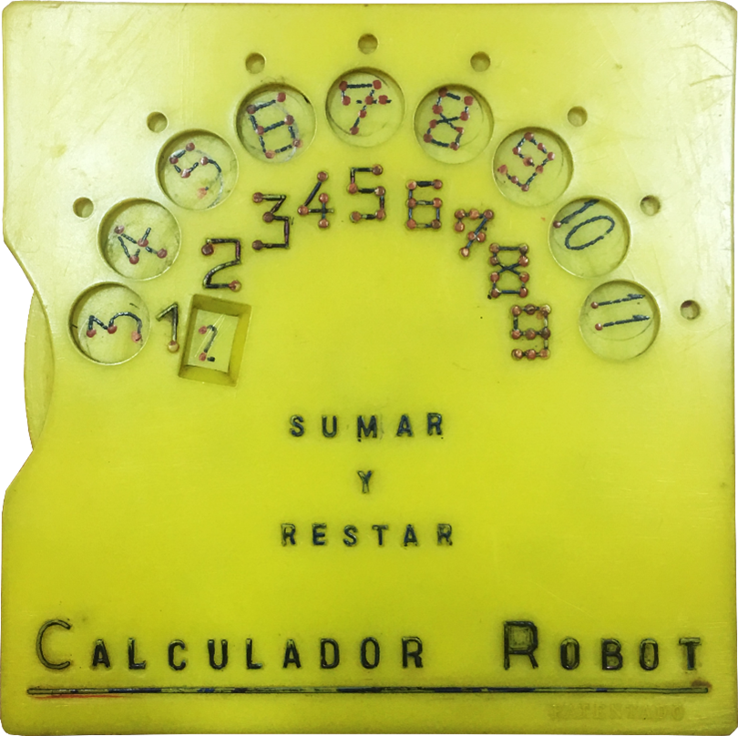 Es un disco calculador para ayudar a aprender las sumas, restas, multiplicación y división de los primeros diez números. En el anverso del disco móvil hay dos escalas logarítmicas, una invertida respecto a la otra, y con solo marcas en los números principales (1 a 9). En el cuerpo una escala logarítmica circular marcando solo los resultados de las multiplicaciones. Situando un número de la escala CI en la ventana, en D se puede ver el resultado de su multiplicación por cada número de la escala C. |