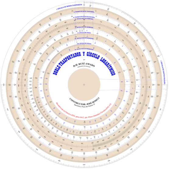 “El distinguido Ingeniero Inspector de Montes, D. Hilarión Ruiz Amado, taquimetrista entusiasta y con muchos años de práctica del nuevo sistema topográfico… haciendo construir… el círculo logarítmico que… lleva su nombre… para efectuar con celeridad y sin molestia los cálculos taquimétricos.” (ROP) En el libro “Teoría de la Regla de Cálculo” por José García Cifré (4ª ed. 1943) también se describe este aparato. |